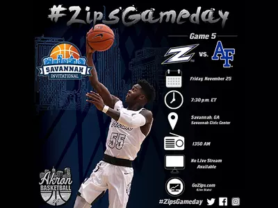 The Akron Zips will travel to Savannah, Ga. to finish the final two games of the Savannah Invitational on Friday, Nov. 25 and Saturday, Nov 26. First, Akron will play Air Force at the Savannah Civic Center, beginning at 7:30 p.m. followed by a win/loss scenario against either East Carolina or Mercer.