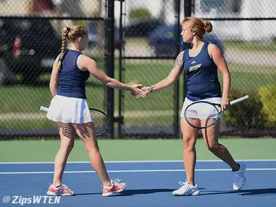 Senior Shannon Newnes (Romford, London)/freshman Rita Pedroso (Porto, Portugal) and junior Sophia Geier (Burgebrach, Germany)/junior Ariadna Blinova (Riga, Latvia) also each won their respective doubles matches to help Akron clinch the doubles point.