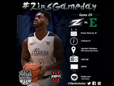 The Akron basketball pursues its 12th consecutive 21-win season against Eastern Michigan on Friday, Feb. 10, at 7 p.m. in Ypsilanti, Mich. at the EMU Convocation Center. The Zips enter the contest after defeating Ball State 65-63 to keep the 29-game home-court winning streak intact. In addition, the Zips' run of consecutive home wins ranks No. 2 in the NCAA behind Oregon (40). Akron owns a four-game lead over the Mid-American Conference with a 10-1 MAC record and 20-4 overall mark. The Zips are 12-0 at home and 6-0 at the JAR in league play. Akron is 4-4 on the road and 4-1 when traveling to a MAC opponent. ESPNU will televise the game with John Brickley calling the action and Adam Finkelstein providing analysis.