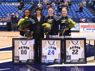 The Zips honored their three seniors, Hannah Plybon (Orrville, Ohio), Alex Ricketts (Mercer, Pa.) and Brittany Gordon (South Charleston, W. Va.) before the contest for their distinguished careers donning the Akron uniform.